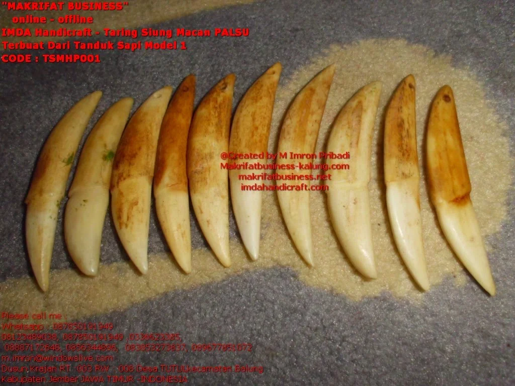 Taring Macan Gigi Harimau PALSU dari Tulang Sapi, Persembahan team MAKRIFAT BUSINESS Sentral Galeri Kerajinan Seni Acecories Souvenir Handicraft Manik Manik Asli Khas Sajian Produk Unggulan Desa TUTUL Balung Jember Jawa Timur, ini kami jual dengan harga :